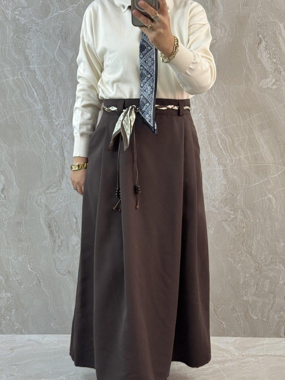 Zarif duruşu ve akıcı formuyla öne çıkan etek, yüksek bel yapısıyla vücut formunu dengeler.
