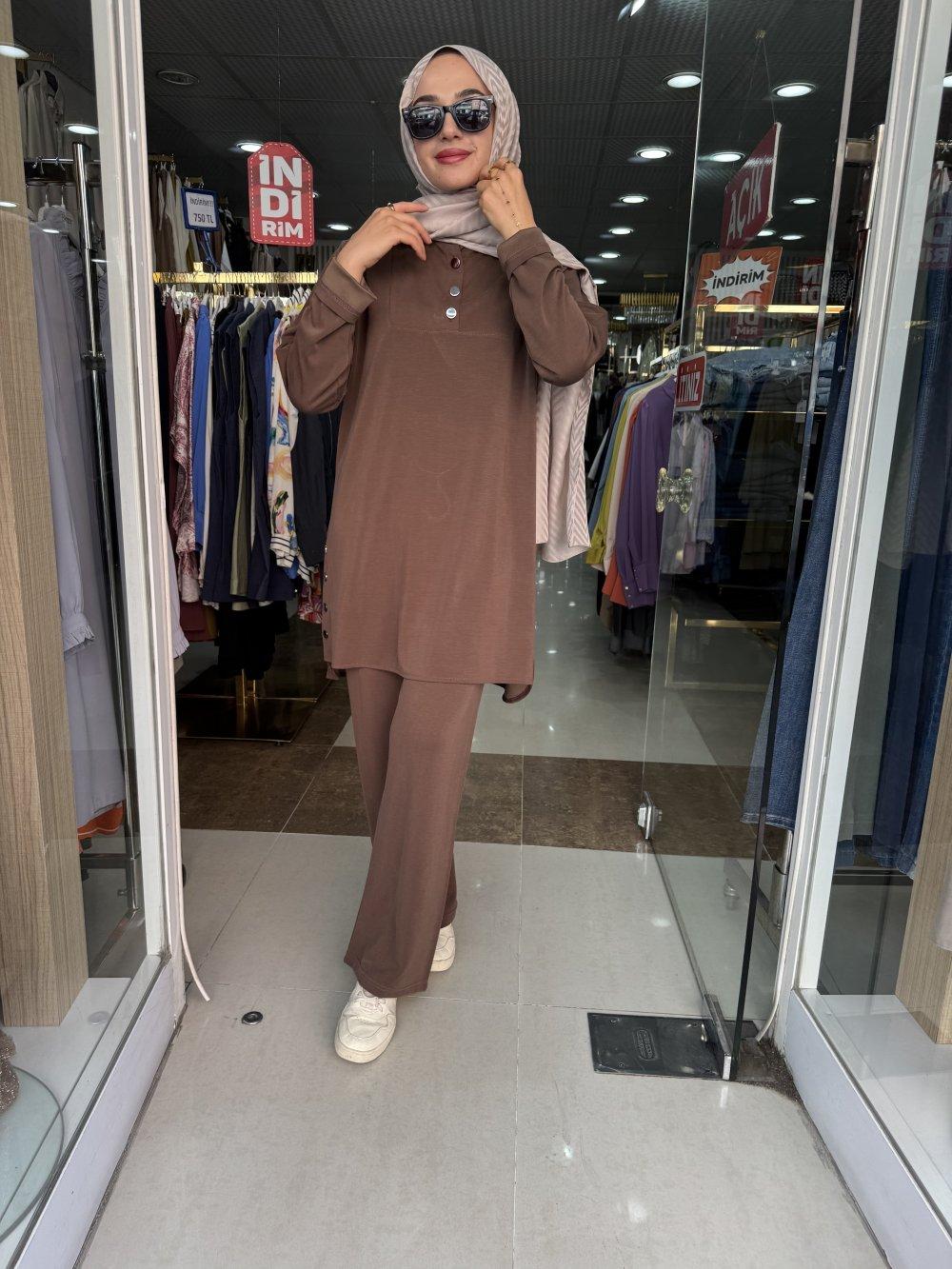 RAYON PENYE DÜĞME PANTOLONLU TAKIM Kahverengi