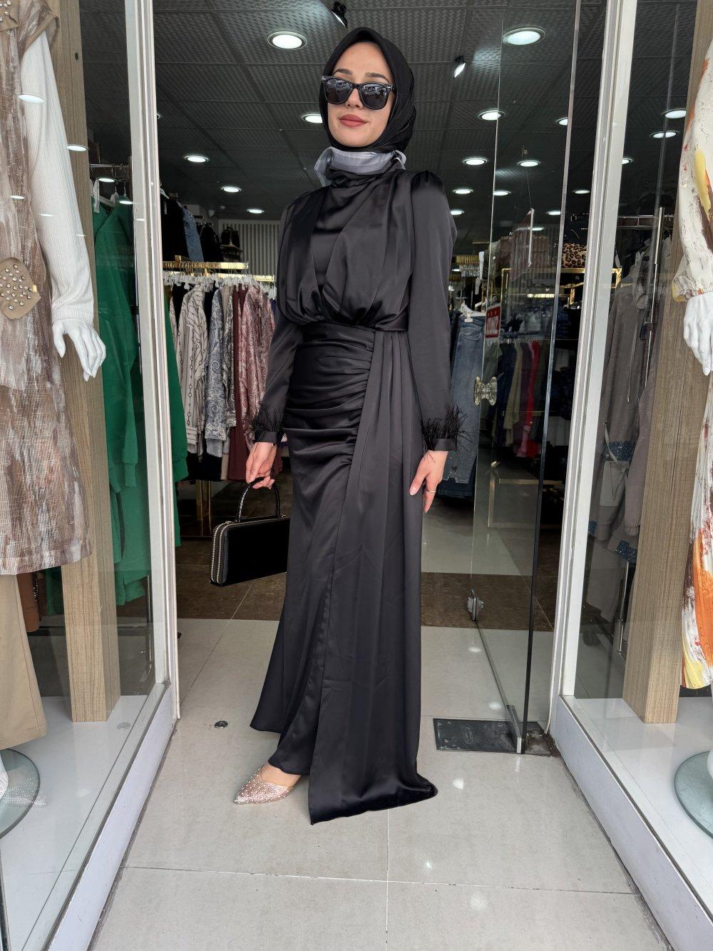 SATEN KOLU TÜYLÜ TANE ELBİSE Siyah