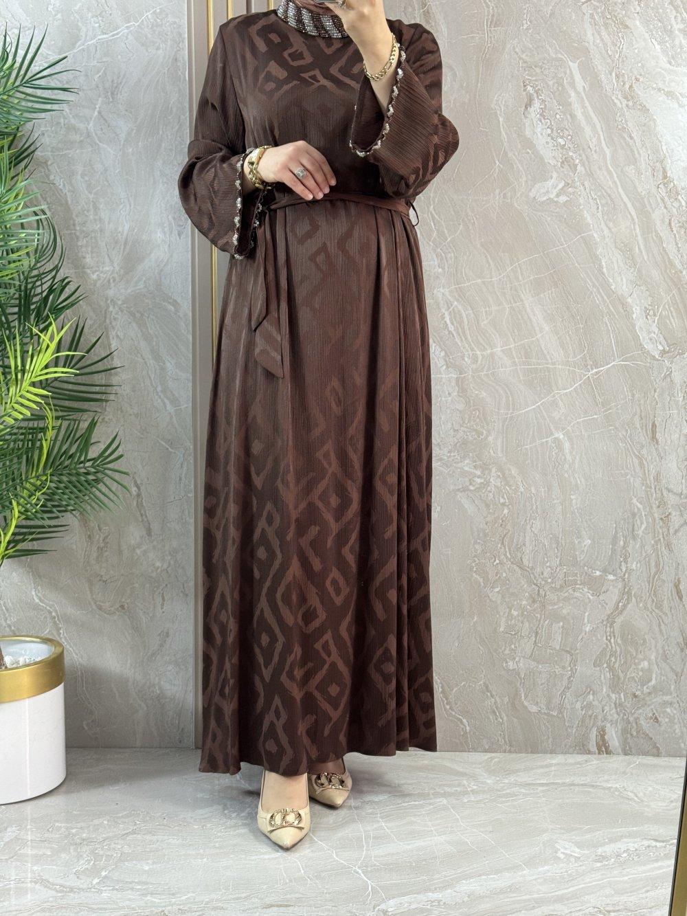 YAKASI TAŞLI GENİŞ KOL KESİM ELBİSE Kahverengi